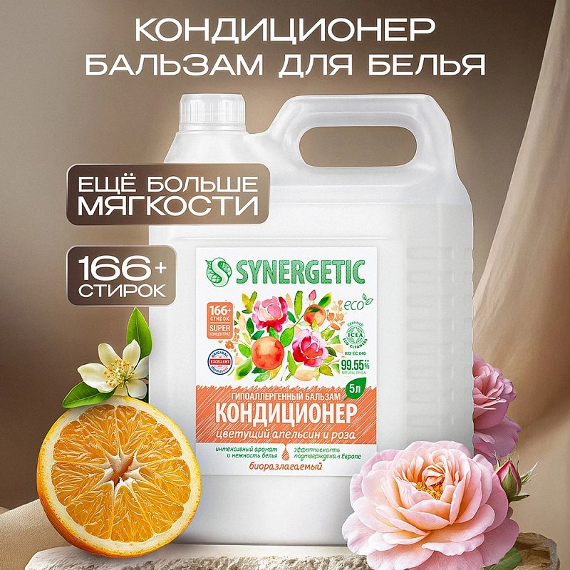 Биоразлагаемый концентрированный гипоаллергенный бальзам-кондиционер для белья SYNERGETIC с нежным ароматом "Цветущий апельсин и роза" на основе масла хлопка придаёт интенсивный аромат и особую нежность белью после стирки.