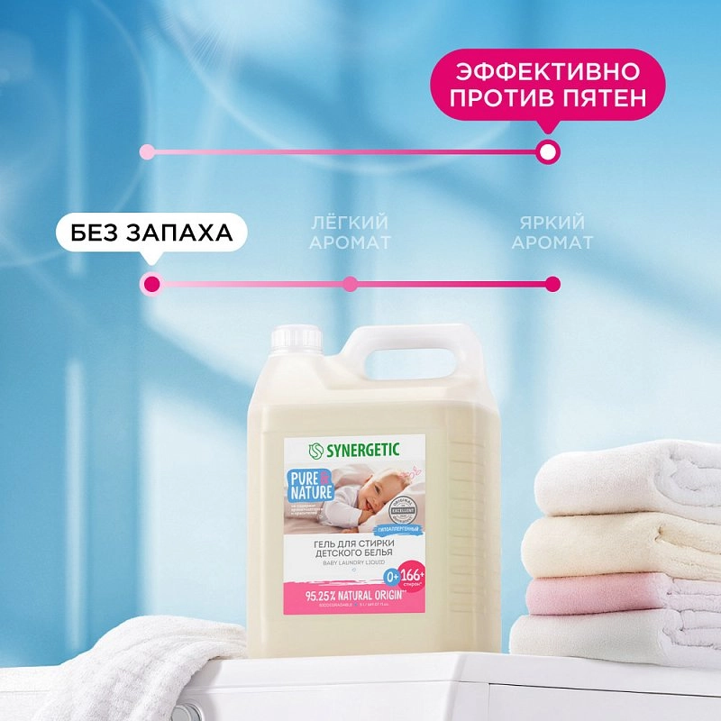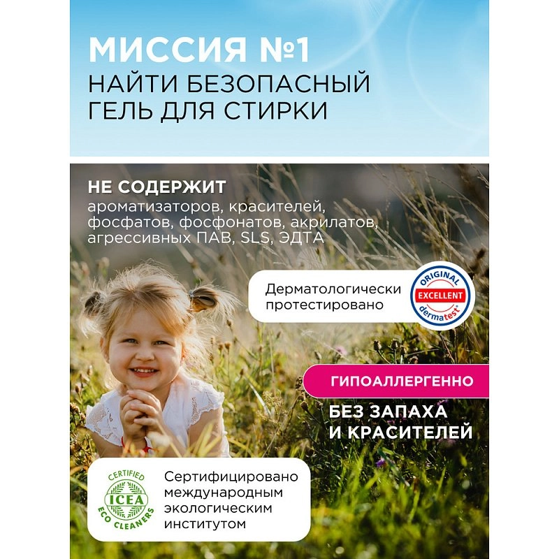 Самое нежное средство в линейке для стирки: только мягкие, эффективные компоненты и ничего лишнего. Подходит для детей с первых дней жизни, а также для аллергиков и чувствительных к запахам людей.