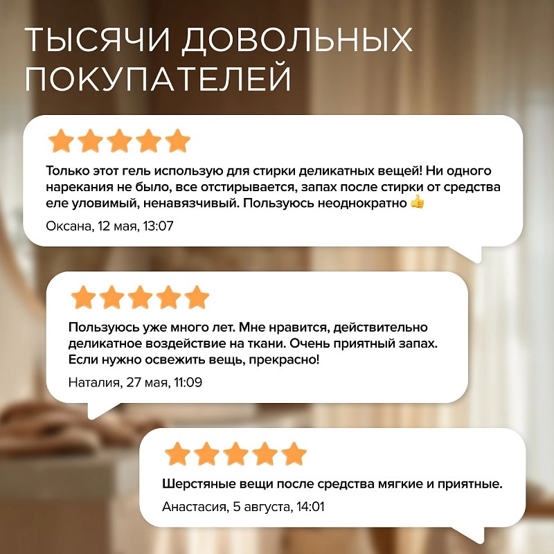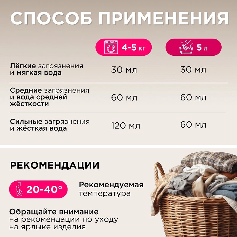 При ручной стирке полностью растворите от 30 до 60 мл геля на 5 литров воды, в зависимости от степени загрязнения и жесткости воды, затем положите бельё и постирайте. После ручной стирки рекомендуется несколько раз прополоскать изделие сначала в тёплой, потом в холодной воде до исчезновения пены.