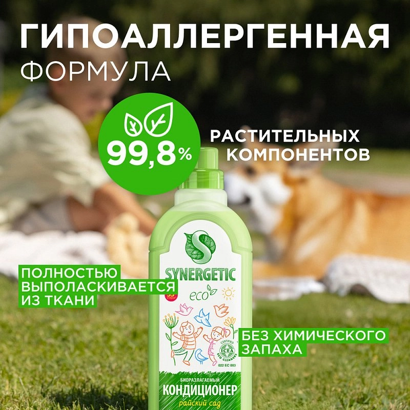 Сейчас объясним, к чему это мы. Средство для стирки обеспечивает чистоту, но именно кондиционер незаметно повышает качество жизни каждый день: смягчает ткань, придает аромат свежести, облегчает глажку и дает антистатический эффект. Вспомните ощетинившиеся махровые полотенца, которые стоят колом после высыхания — огрубевшая ткань хуже впитывает влагу и раздражает кожу. Кондиционер SYNERGETIC справляется со своей задачей даже в жесткой воде и заботится о вашем хорошем настроении каждый день.