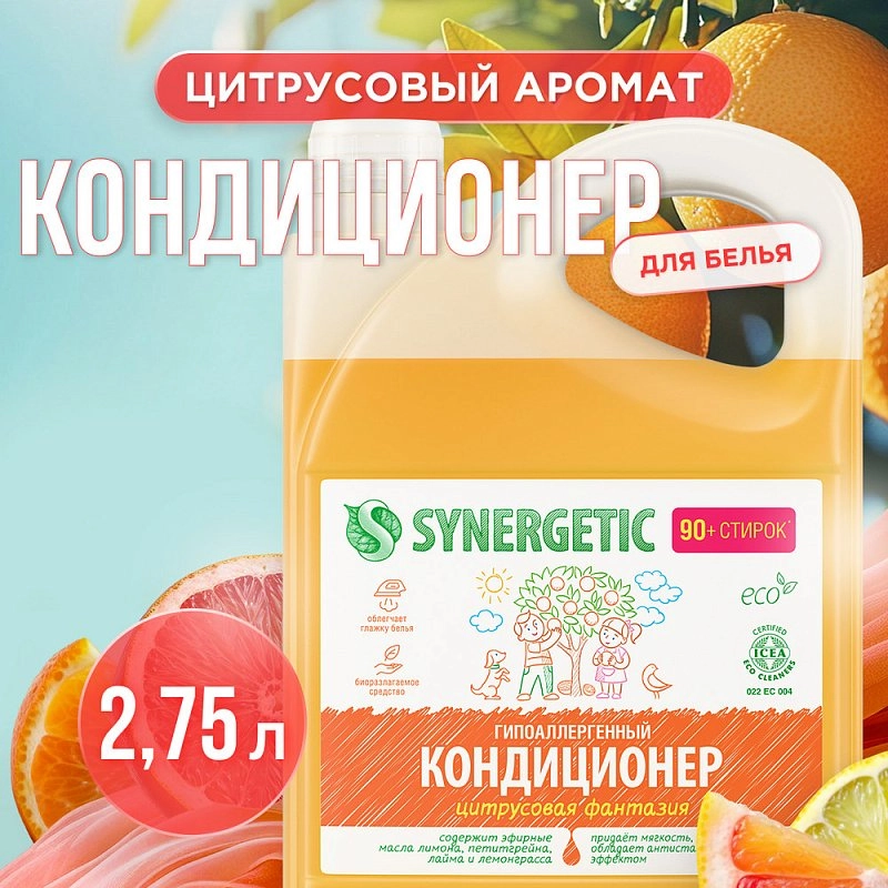 Сейчас объясним, к чему это мы. Средство для стирки обеспечивает чистоту, но именно кондиционер незаметно повышает качество жизни каждый день: смягчает ткань, придает аромат свежести, облегчает глажку и дает антистатический эффект. Вспомните ощетинившиеся махровые полотенца, которые стоят колом после высыхания — огрубевшая ткань хуже впитывает влагу и раздражает кожу. Кондиционер SYNERGETIC справляется со своей задачей даже в жесткой воде и заботится о вашем хорошем настроении каждый день.
