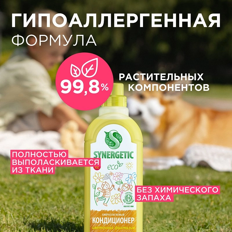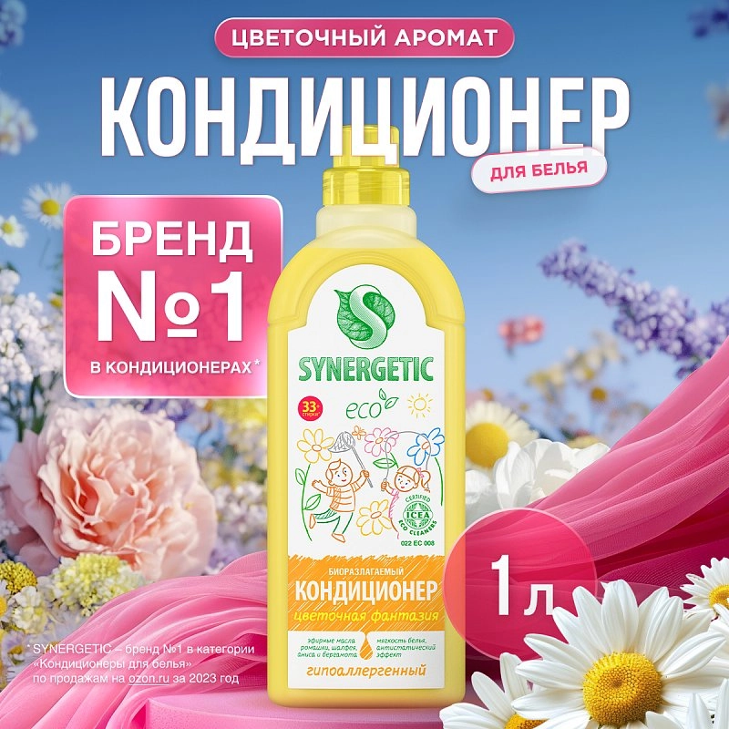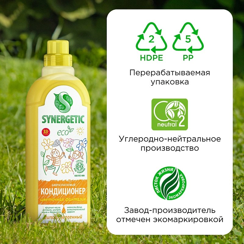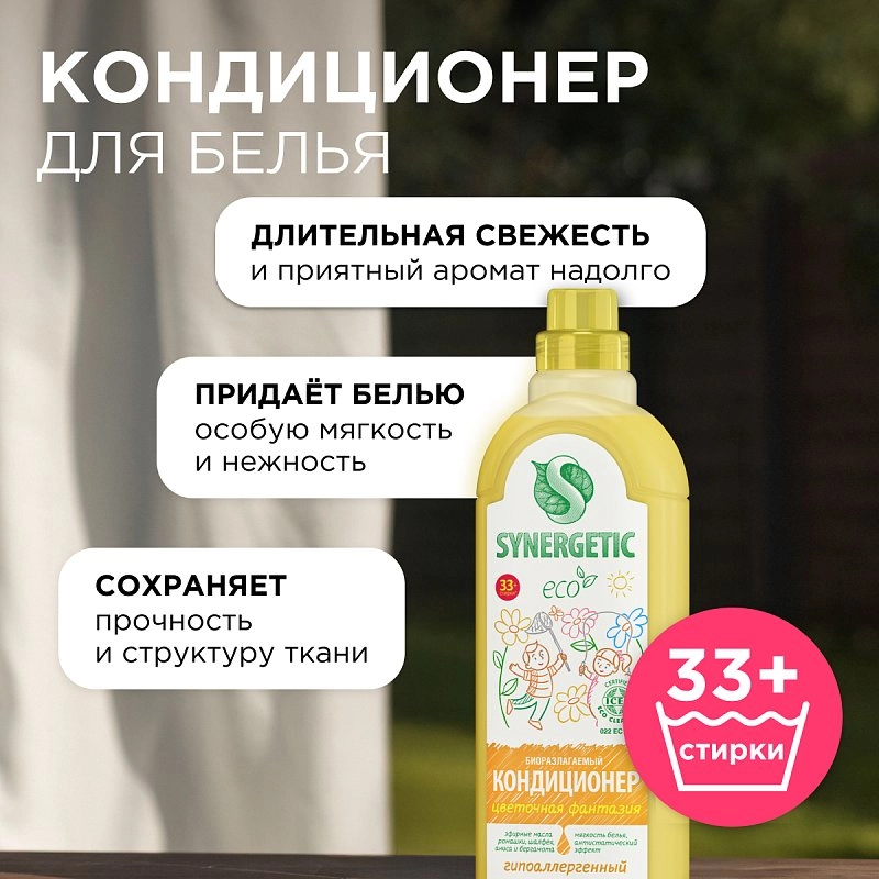 Сейчас объясним, к чему это мы. Средство для стирки обеспечивает чистоту, но именно кондиционер незаметно повышает качество жизни каждый день: смягчает ткань, придает аромат свежести, облегчает глажку и дает антистатический эффект. Вспомните ощетинившиеся махровые полотенца, которые стоят колом после высыхания — огрубевшая ткань хуже впитывает влагу и раздражает кожу. Кондиционер SYNERGETIC справляется со своей задачей даже в жесткой воде и заботится о вашем хорошем настроении каждый день.