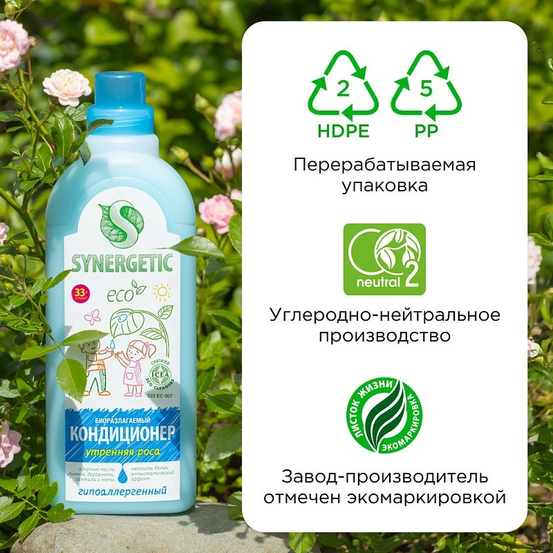 Сейчас объясним, к чему это мы. Средство для стирки обеспечивает чистоту, но именно кондиционер незаметно повышает качество жизни каждый день: смягчает ткань, придает аромат свежести, облегчает глажку и дает антистатический эффект. Вспомните ощетинившиеся махровые полотенца, которые стоят колом после высыхания — огрубевшая ткань хуже впитывает влагу и раздражает кожу. Кондиционер SYNERGETIC справляется со своей задачей даже в жесткой воде и заботится о вашем хорошем настроении каждый день.
