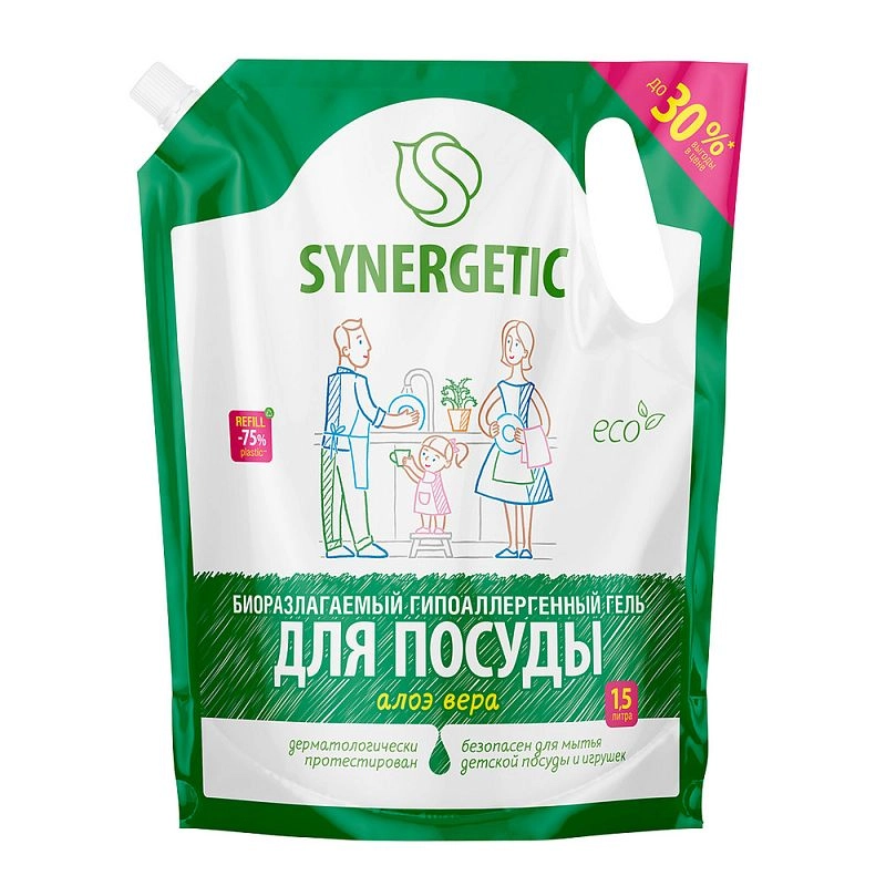 Биоразлагаемый концентрированный гель для посуды SYNERGETIC - это экологичное, безопасное и эффективное средство для мытья всех видов посуды, в том числе детской, кухонного инвентаря и детских игрушек от любых видов загрязнений.