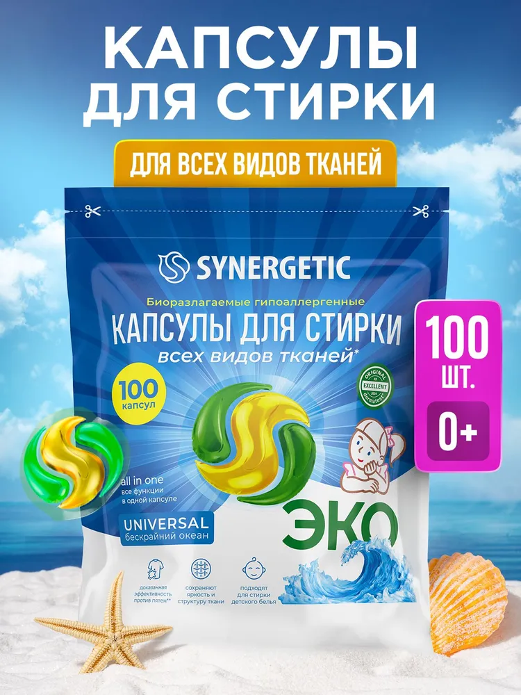 Биоразлагаемые концентрированные гипоаллергенные капсулы для стирки всех видов тканей SYNERGETIC UNIVERSAL обеспечивают гигиеническую чистоту, устраняя пятна и неприятные запахи.