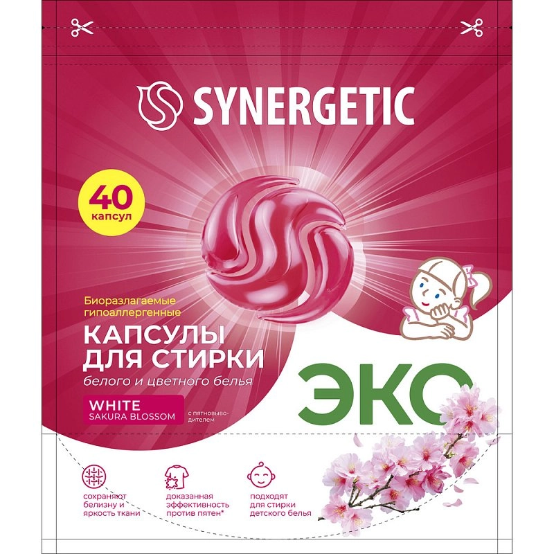 Биоразлагаемые капсулы для стирки белого и цветного белья SYNERGETIC White с ароматом "Цветущая сакура" обеспечивают гигиеническую чистоту тканей, устраняя пятна и неприятные запахи.