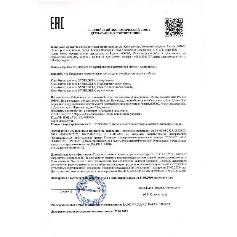 Крем-баттер для тела SYNERGETIC табак-ваниль с комплексом масел ши, макадамии, кокоса и виноградной косточки максимально питает и глубоко увлажняет кожу, помогает устранить сухость и шелушение, повышает упругость и эластичность, а также оставляет на коже пряный амбровый аромат.