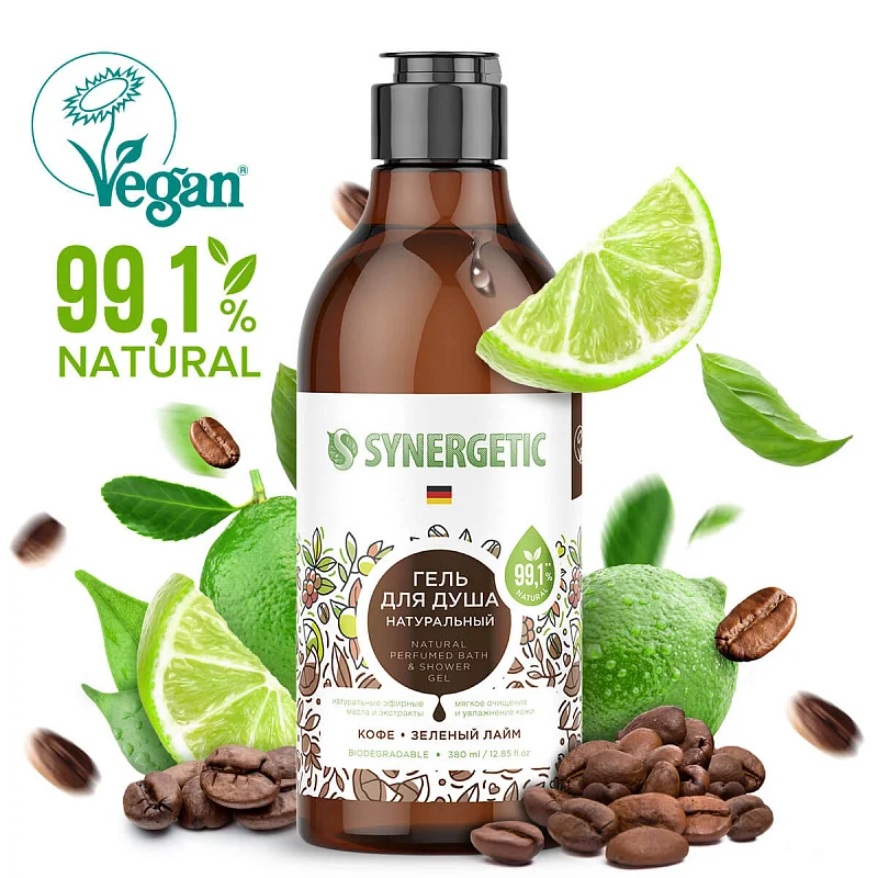 Натуральный биоразлагаемый гель для душа SYNERGETIC «Кофе и зеленый лайм» — это деликатное средство для очищения кожи, на 99,1% состоящее из натуральных компонентов. Гипоаллергенный аромат геля SYNERGETIC «Кофе и зеленый лайм» разработан в швейцарском доме Givaudan с использованием натуральных эфирных масел кедра, пачули и бархатцев.