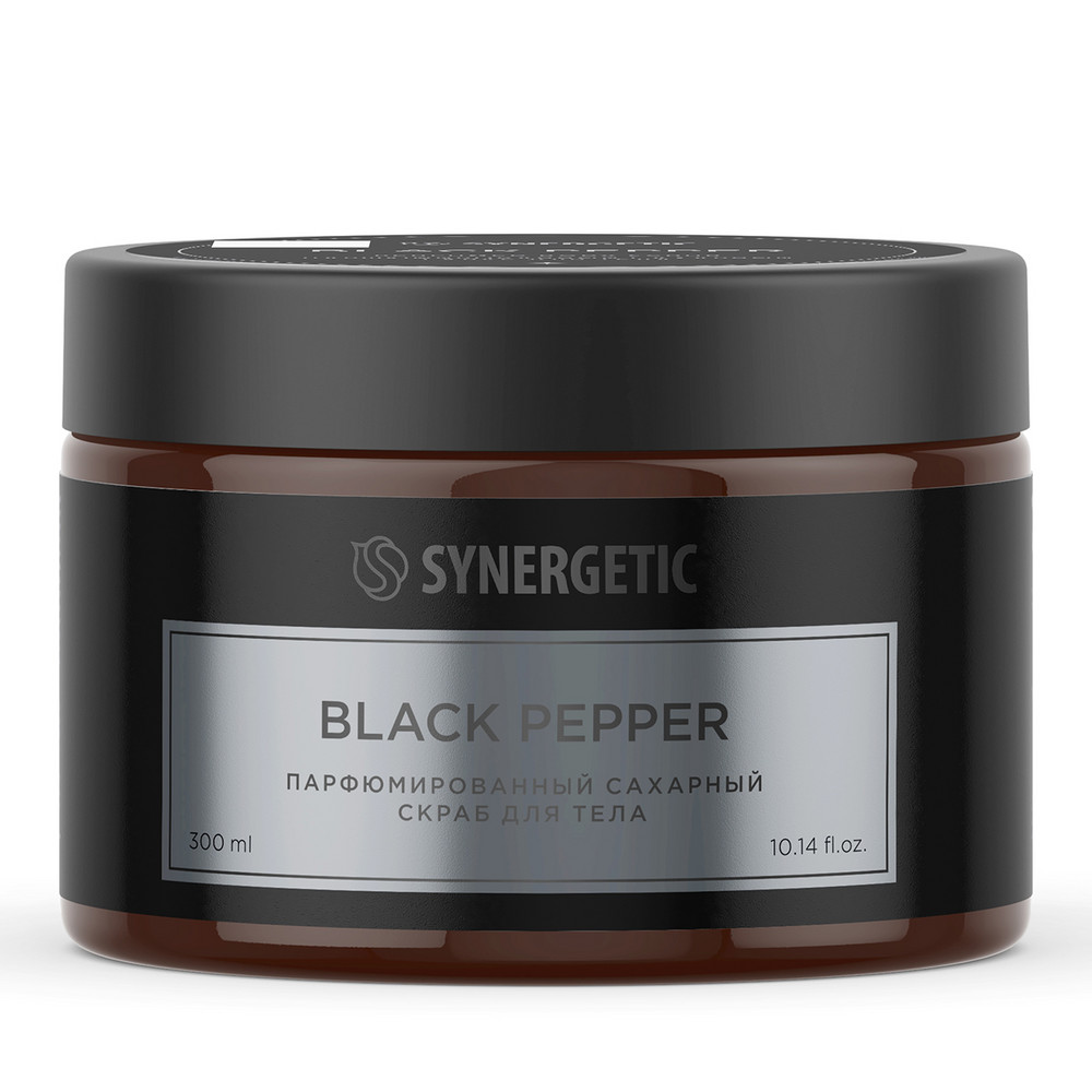 Парфюмированный скраб для тела SYNERGETIC черный перец деликатно отшелушивает и очищает кожу. Экстракты кедра и шалфея тонизируют кожу, масло черного тмина дарит упругость, а масло ши бережно увлажняет.