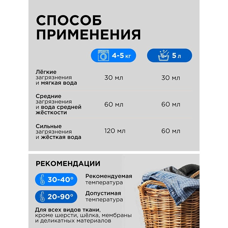 При ручной стирке полностью растворите от 30 до 60 мл геля на 5 литров воды, в зависимости от степени загрязнения и жесткости воды, затем положите бельё и постирайте. После ручной стирки рекомендуется несколько раз прополоскать изделие сначала в тёплой, потом в холодной воде до исчезновения пены.