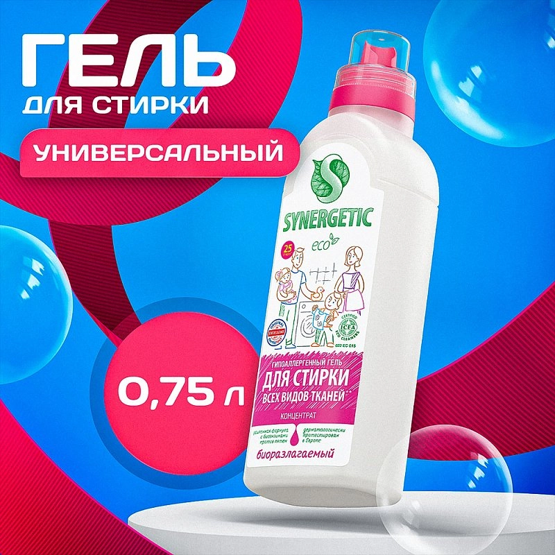 Универсальный концентрированный гель для стирки SYNERGETIC обеспечивает бережное и эффективное очищение тканей, гигиеническую чистоту одежды и устраняет неприятные запахи. Комплексный состав заботится обо всех тканях с простым и даже деликатным характером. Стирайте хлопок, синтетику и смешанные материалы, не переживая за их внешний вид и долговечность, а для особенной мягкости белья и усиления аромата используйте гель для стирки вместе с кондиционерами—ополаскивателями SYNERGETIC.