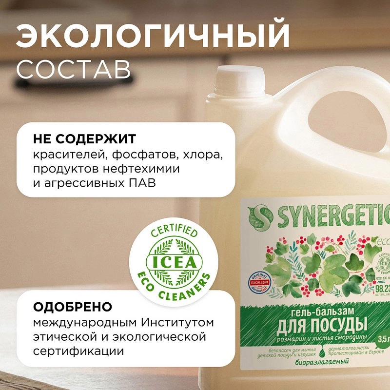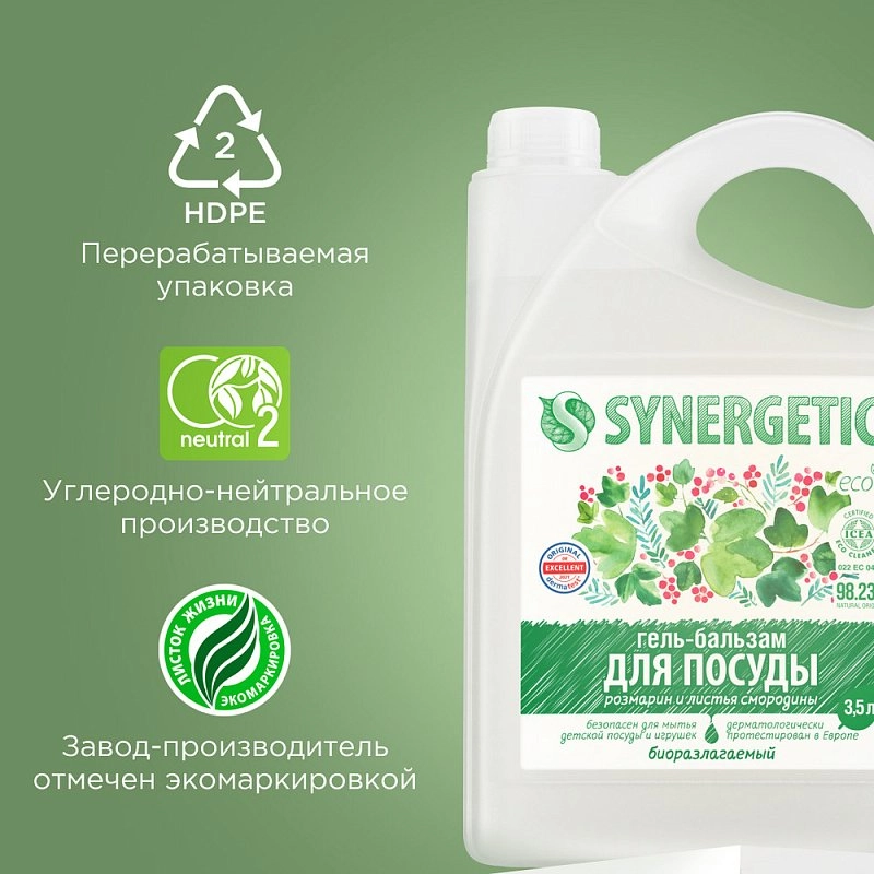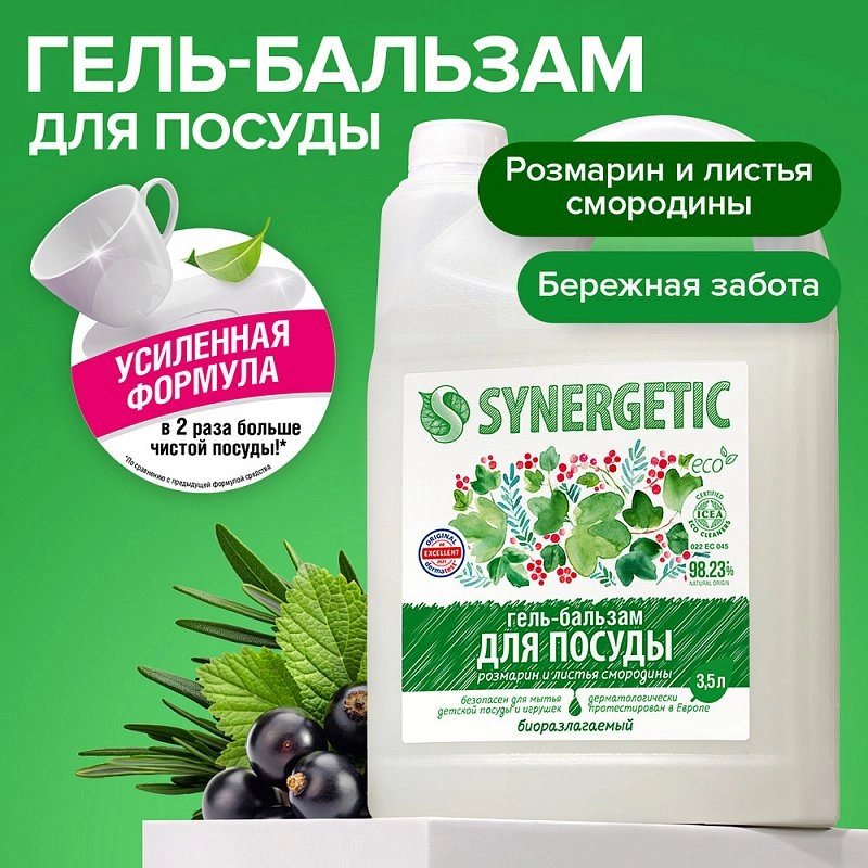Формула геля-бальзама для посуды SYNERGETIC — это идеальный баланс эффективного моющего средства, пенообразования и бережного отношения к коже.