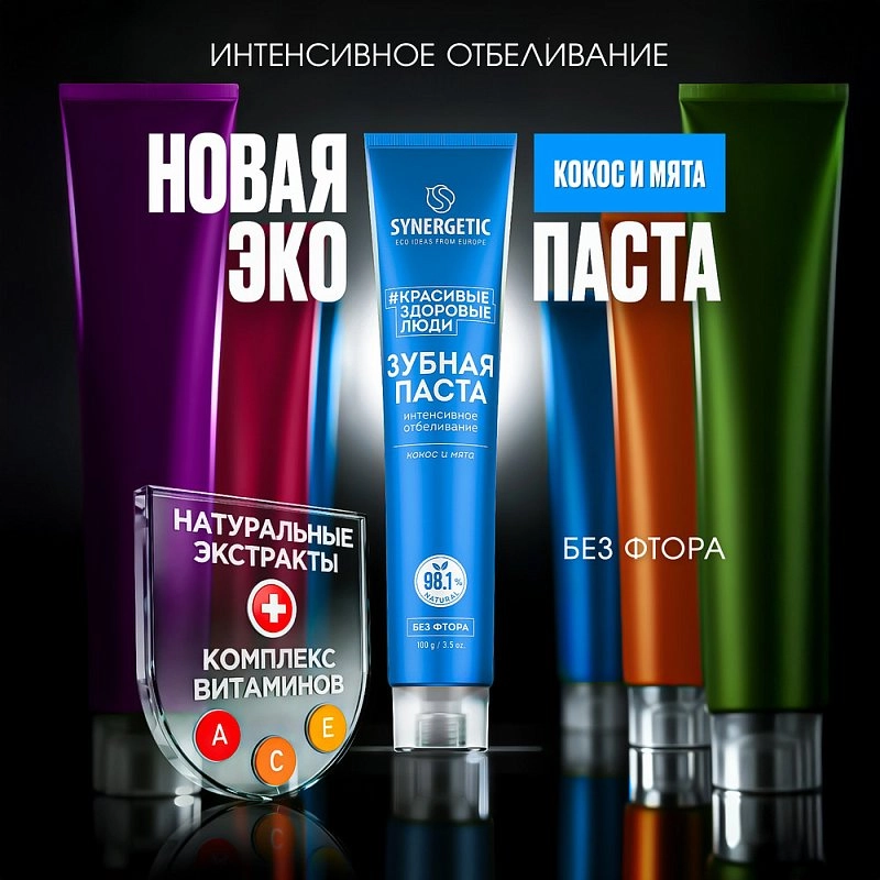 Зубная паста SYNERGETIC "Интенсивное отбеливание" — это безопасная и эффективная формула с высокой концентрацией натуральных компонентов для бережного ухода за зубами и дёснами. Активные компоненты зубной пасты эффективно очищают и способствуют интенсивному осветлению зубной эмали.