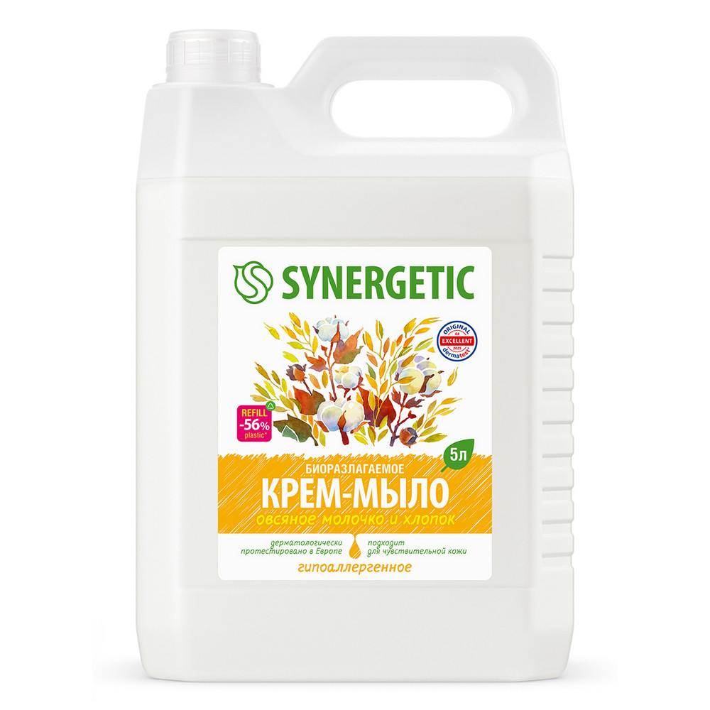 Крем-мыло жидкое биоразлагаемое для мытья рук и тела SYNERGETIC «Овсяное молочко и хлопок» идеально подходит для бережного очищения кожи рук и тела от любых загрязнений, даже в холодной воде. Оно эффективно удаляет запахи благодаря уникальной формуле с растительными А-тензидов и натуральными эфирными маслами.