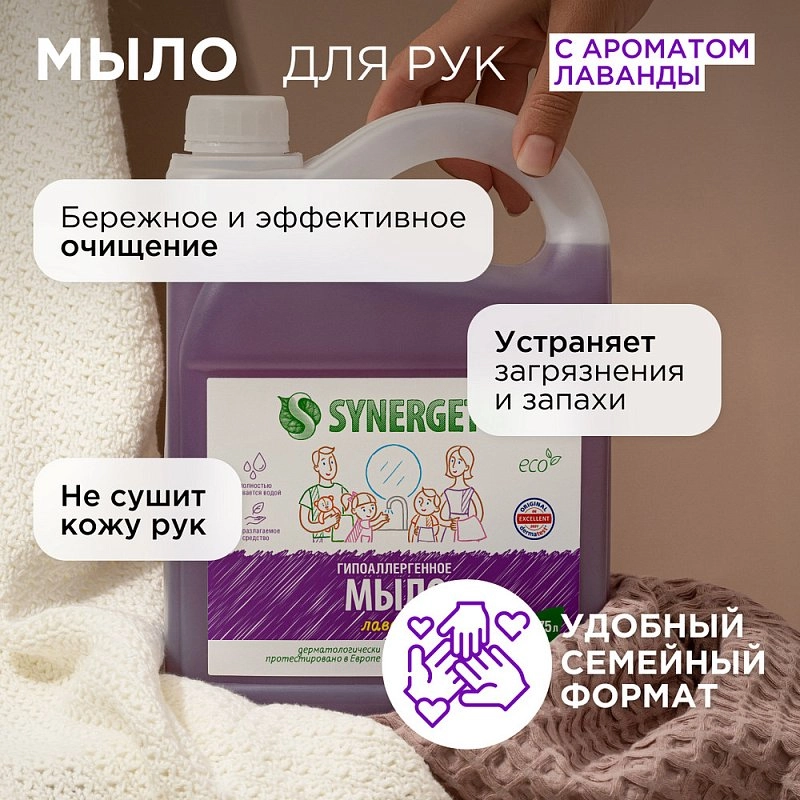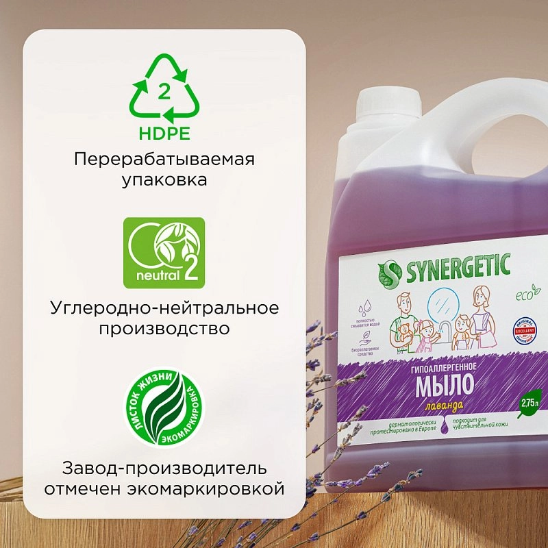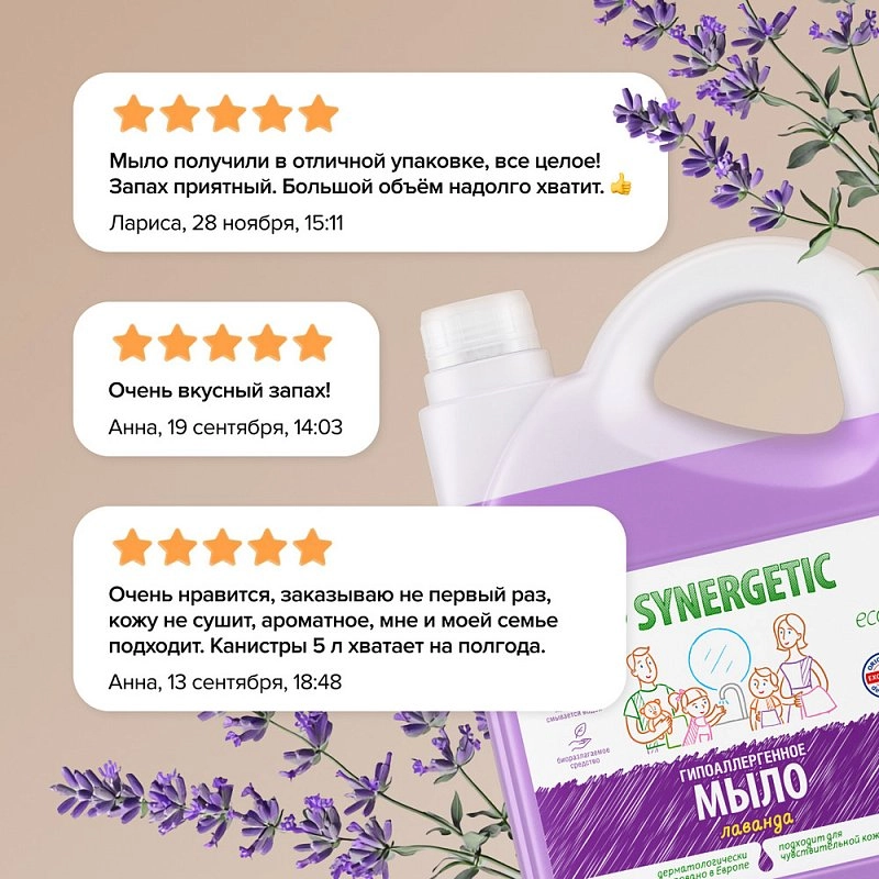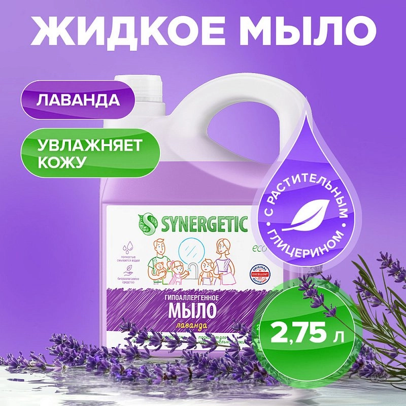 Биоразлагаемое увлажняющее мыло SYNERGETIC "Лаванда" подходит для бережного очищения кожи рук и тела от любых загрязнений.
