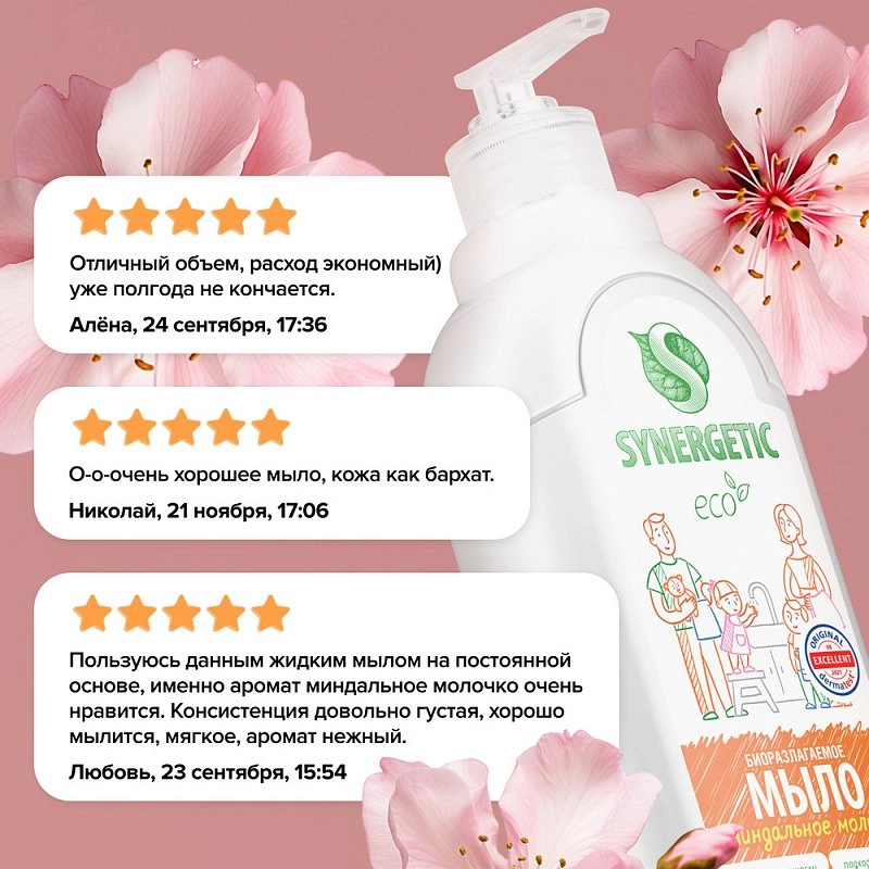 Биоразлагаемое увлажняющее мыло SYNERGETIC "Миндальное молочко" подходит для бережного очищения кожи рук и тела от любых загрязнений. Комбинация растительных А-тензидов, морской соли и натуральных эфирных масел корицы, аниса и сантала эффективно устраняет загрязнения и неприятные запахи даже в холодной воде.