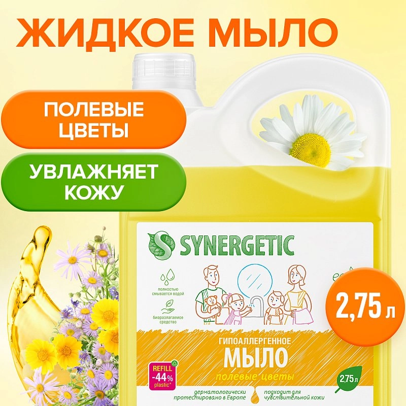 Биоразлагаемое увлажняющее мыло SYNERGETIC "Полевые цветы" подходит для бережного очищения кожи рук и тела от любых загрязнений.