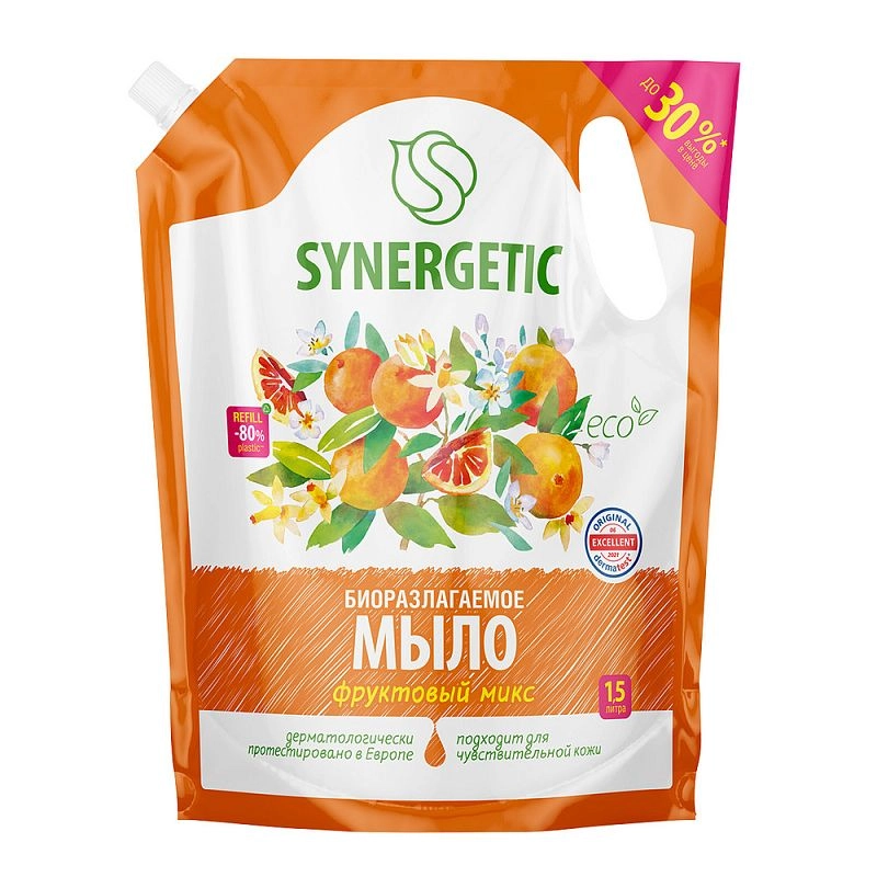 Биоразлагаемое увлажняющее мыло SYNERGETIC "Фруктовый микс" подходит для бережного очищения кожи рук и тела от любых загрязнений. Комбинация растительных А-тензидов, морской соли и натуральных эфирных масел пачули, жасмина, ветивера, нероли и розы эффективно устраняет загрязнения и неприятные запахи даже в холодной воде.